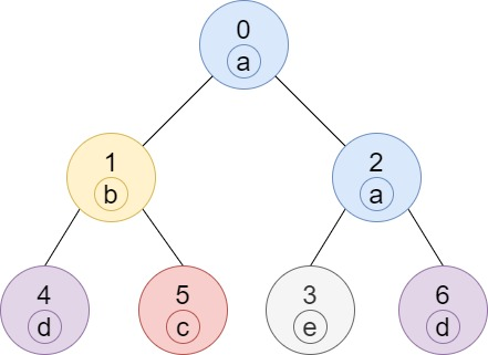 输入:n = 7, edges = [[0,1],[0,2],[1,4],[1,5],[2,3],[2,6]], labels = “abaedcd”
