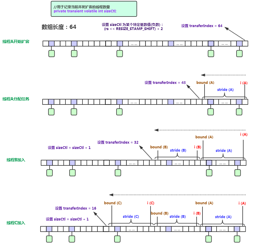 表示没有线程在扩容,使用CAS将sizeCtl的值改为(rs << RESIZE_STAMP_SHIFT) + 2)。 - sc < 0